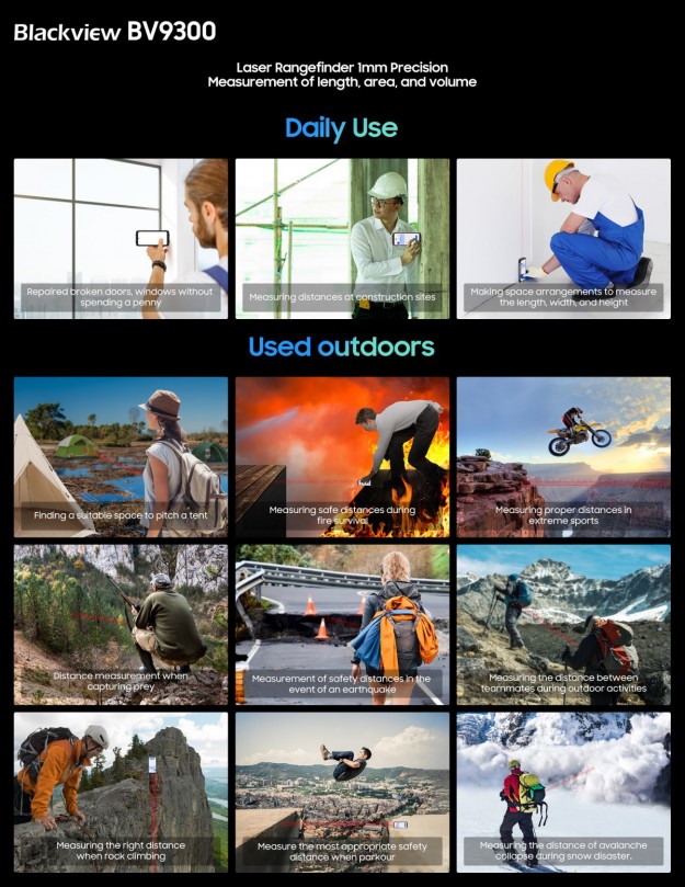Лазерний далекомір, ліхтарик - велике оновлення!!!Кажуть, що Blackview помітив потреби користувачів, які цікавились можливістю робити виміри на відстані для уточнення будівельних даних або пошуку підходящих місць для відпочинку під час встановлення намету, BV9300 гарантує точність інструменту для вимірювання - лазерний далекомір вимірює з точністю до 1 мм і на це йому потрібно всього 0,3 секунди. Незалежно від того, чи йдеться про планування приміщень, чи про екстремальні види спорту, BV9300 витримує вимірювання довжини, площі та об'єму на відстані до 40 метрів, доводячи, що він є надійним партнером для хобі та роботи.