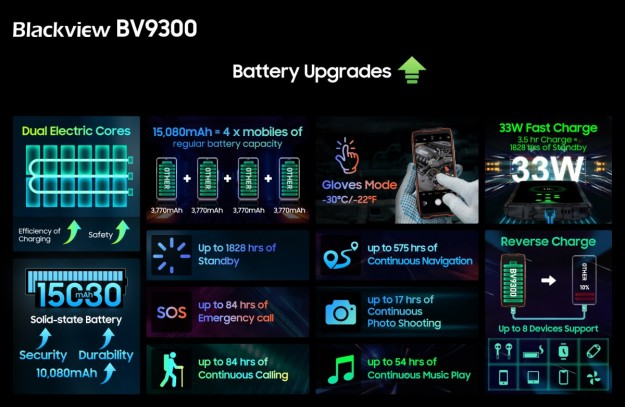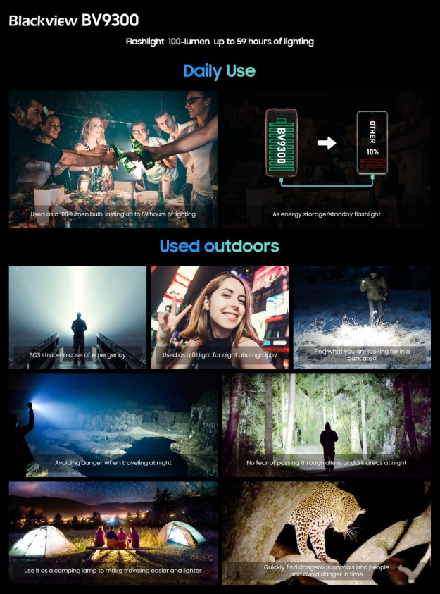 Враховуючи брак світла для користувачів, які подорожують вночі або досліджують печери, Blackview BV9300 буде корисний і їм, адже буде поставлятися з ліхтариком на 100 люмен, який може світити на відстані до 10 метрів і має SOS-стробоскоп. Навіть у разі надзвичайної ситуації користувачі зможуть швидко привернути увагу оточуючих до себе.