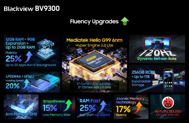 8-ядерний процесор Helio G99 (6 нм) + до 21 ГБ оперативної пам'яті та 256 ГБ ПЗУ, адаптивна частота оновлення екрану 120 ГцВраховуючи попит користувачів на більш плавну роботу, BV9300, як король продуктивності в лінійці Blackview, стане першим пристроєм компанії з восьмиядерним чіпсетом Helio G99, виготовленим за 6-нм техпроцесом. Цей чіпсет має два великих ядра Cortex-A76 з тактовою частотою до 2,2 ГГц і шість малих ядер Cortex-A55 з тактовою частотою до 2,0 ГГц. Завдяки технології Atomic Memory та до 21 ГБ оперативної пам'яті, BV9300 збільшує швидкість роботи в більшості режимах до 50%.