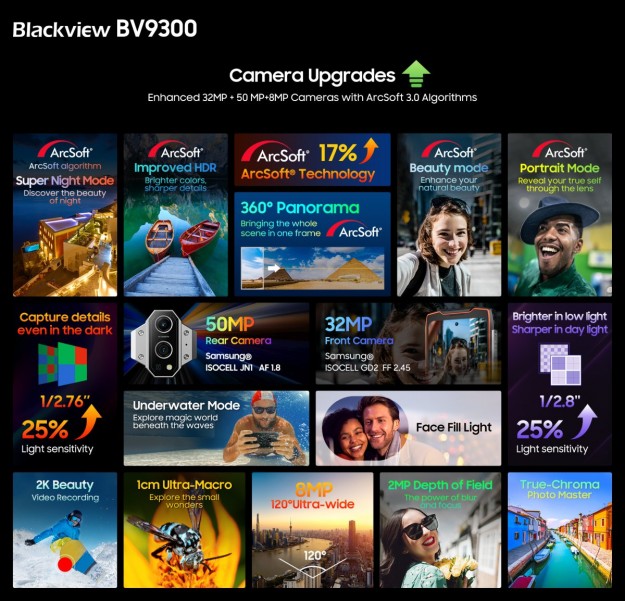 Крім того, BV9300 має постійну пам’ять об'ємом 256 ГБ і розширювану до 1 ТБ картками microSD пам'яті TF, що дозволяє користувачам зберігати велику кількість фотографій, відео та файлів, необмежуючи себе під час поїздок на природу і по роботі. Вдосконалені камери 50 Мп+32 Мп з алгоритмами ArcSoft 3.0Враховуючи, що користувачі можуть знімати більше та більш якісніші зображення на природі, а також робити приголомшливі фото навіть в умовах недостатньої освітленості. BV9300 буде оснащений першою в лінійці Blackview 32-мегапіксельною фронтальною камерою Samsung та 50-мегапіксельною основною камерою Samsung. Великий сенсор 1/2.8'' збільшує світлочутливість на 25%, дозволяючи користувачам робити реалістичні фотографії навіть у темряві. Великий акумулятор на 15080 мАг забезпечить безперервну зйомку до 17 годин, а запис відео у форматі 2K з режимом краси дозволить фотографам-початківцям легко стати відеоблогерами.