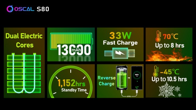 Завдяки потужності заряджання 33 Вт і технології двох електричних ядер Oscal S80 розроблено для безпечної зарядки від 0 до 51% за 66 хвилин. Крім того, підтримка зворотної зарядки полегшує зарядку інших пристроїв навіть у віддалених до електрики місцях. Незважаючи на акумулятор ємністю 13 000 мАг, смартфон може працювати в екстремальних умовах від -45 ? протягом до 10,5 годин до 70 ? протягом до 8 годин. Отримайте знімки високої чіткості за допомогою вдосконаленого алгоритму– Камера з підтримкою Arcsoft + 12 МП Sony® IMX362 + 8 МП надширококутний/макро об’єктив