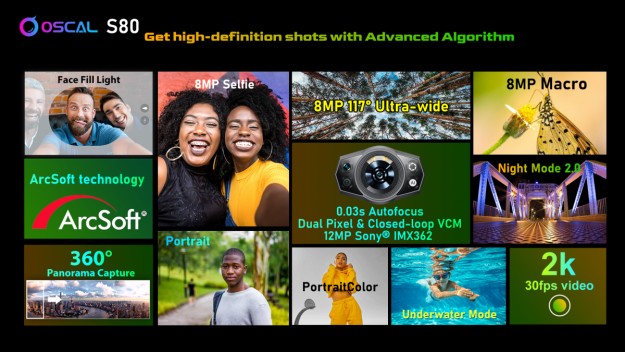 Oscal S80 може похвалитися 12-мегапіксельним датчиком Sony® IMX362, який фіксує епічні моменти з чутливістю до 200% світла для зйомки вночі, швидким автофокусом 0,03 секунди, що добре для фото, наприклад, собаки, що біжить, і безперервною серійною зйомкою 10 кадрів/с для зйомки спортсменів, які грають у футбол. Більше того, Oscal S80 отримає 8-мегапіксельну ультрашироку камеру, яка підтримує об’єктив з кутом 117 градусів і ультрамакрооб’єктив 2 см для зйомки неба та дрібних комах прямо на своєму зап’ясті.