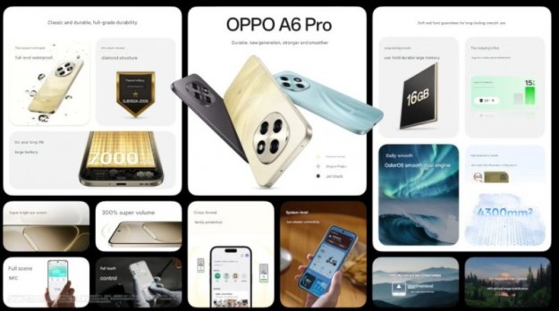 У OPPO з'явився новий смартфон — OPPO A6 Pro. Апарат отримав екран OLED з діагоналлю 6,57 дюйма, роздільною здатністю Full HD+ і частотою оновлення 120 Гц. Екран забезпечує охоплення 100% колірного простору DCI-P3, максимальна частота регулювання ШІМ — 2160 Гц. В основі апаратної платформи лежить SoC MediaTek Dimensity 7300.