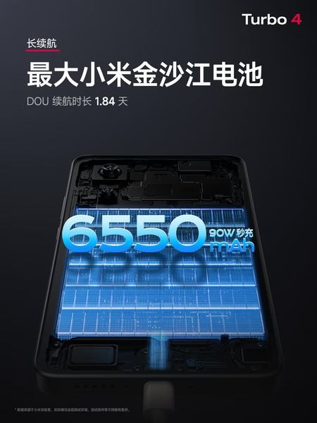 Redmi Turbo 4 отримав акумуляторну батарею ємністю 6550 мАг, і в ній є одна цікава особливість. Спеціальний чип відповідає за температурний режим, і, як і в електромобілі Xiaomi SU7, тут реалізовано швидкий розігрів батареї при негативних температурах. Саме тому виробник заявляє, що батарея може працювати за температури -35 °С. Сам акумулятор розрахований на 1600 циклів заряду і розряду. Підтримується зарядка потужністю 90 Вт, на повну зарядку батареї йде всього 45 хвилин.