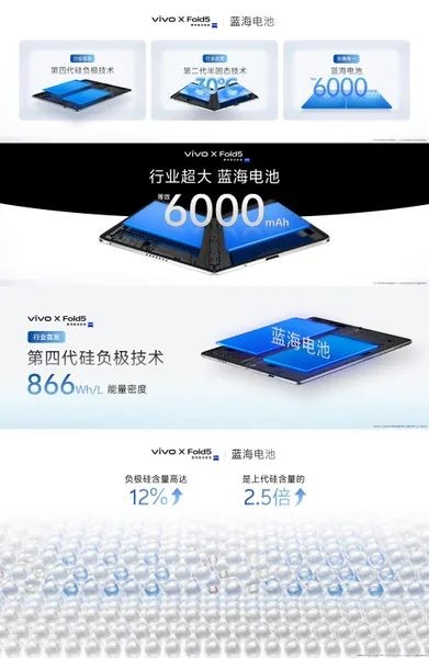 Головною особливістю vivo X Fold5 є величезна (за мірками класу) батарея ємністю 6000 мАг, розділена на два модулі (3,275 мАг і 2,725 мАг). Крім того, це перший складаний смартфон з максимальним ступенем захисту від води - IPХ9. Також заявлено захист IP5X від пилу і можливість роботи при екстремально низьких температурах до -20°C.