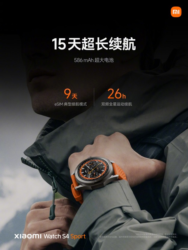 Ємність акумулятора Xiaomi Watch S4 Sport становить 586 мАг, максимальна автономність - 15 днів. При використанні eSIM автономність скорочується до 9 днів, а при дуже активній роботі можна розраховувати на 26 годин автономності.