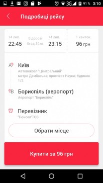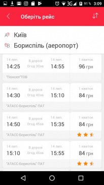 Попробуем подобрать несколько маршрутов и посмотреть, что нам предлагает Busfor. Результат ниже на скриншотах. На картинке не видно всего списка предложений. Ведь если ищете автобус Киев - Борисполь, то в отсортированном по времени списке можно выбрать самую подходящую цену от различных перевозчиков-партнеров. Потом выбираете место и делаете покупку, указав свои контактные данные.