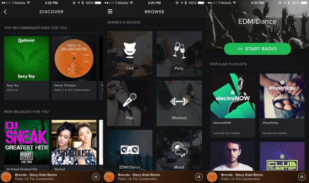 Популярный сервис среди пользователей Apple и Android, который позволяет следить как за самим исполнителем, так и за другими пользователями. Подписчику приложения даётся бесплатный первый месяц, после –покупка премиум аккаунта ценой в 200 грн, 600 рублей или 10$. Пользователи «Spotify» могут создавать собственные плейлисты, делиться с другими, а также совместно их редактировать. Когда заканчивается пробный месяц, единственным неудобством является реклама, как во время воспроизведения самой музыки, так и на экране.