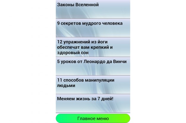 Ссылка на Google Play: https://play.google.com/store/apps/details?id=dev.belka.sovetgrandma Правила жизни – набор постулатов и идей, которые могут принести в вашу жизнь богатство, долголетие и здоровье. Конечно, прочитать все материалы их приложения будет недостаточным, так как без активного применения их на практике результата не будет. Из правил жизни можно узнать об основных законах вселенной, правилах управления и манипуляции другими людьми, наборе упражнений для занятия йогой, фитнесом и многом другом. Почти пол миллиона человек скачали себе эту программу на свое устройство. Ее преимущество в том, что разработчик постоянно обновляет свой софт, отвечает на комментарии и исправляет ошибки в интерфейсе и текстах. Не зря пользователи поставили «Правилам жизни» рейтинг 4.5 – это самый высокий балл из близких по тематике софтин.