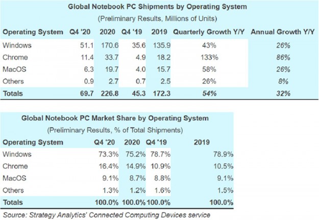 Как минимум, в секторе ноутбуков подобная ситуация не нова. В 2019 году компания Strategy Analytics уже сообщала, что доля рынка мобильных компьютеров с Chrome OS по количеству проданных единиц достигла 10,5 % против 9,1 % у MacBook. Но эти цифры резко выросли в течение 2020 года: теперь доля Chrome OS на рынке ноутбуков составила уже 14,9 %, а macOS — 8,7 %. Доля Windows по количеству проданных ноутбуков упала с 78,9 % в 2019 году до 75,2 % в 2020 году. Если же брать только четвёртый квартал 2020 года, то, согласно данным SA, продажи ПК с Chrome OS достигли 16,4 % от всех проданных ноутбуков против 9,1 % у macOS и 73,3% у Windows.