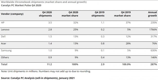 SA сообщила, что в 2020 году и особенно в четвёртом квартале хромбуки превзошли MacBook по продажам. Исследовательская фирма IDC, включившая в свой анализ настольные компьютеры, сообщила аналогичные результаты. Третья аналитическая компания, Canalys, собрала данные, показывающие, что общие мировые поставки хромбуков увеличились почти в четыре раза в 2020 году до 11,2 млн единиц по сравнению с 2,9 млн в 2019 году.