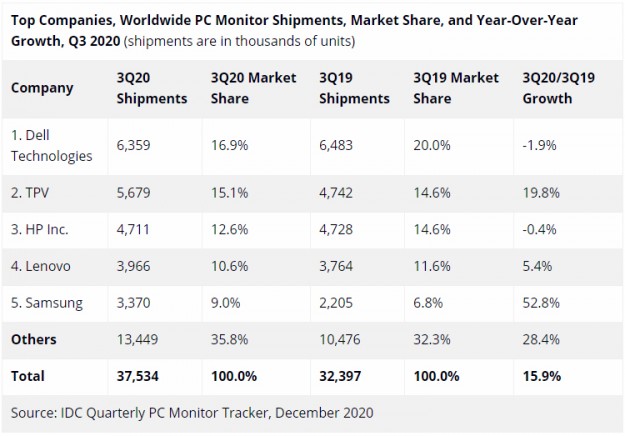 Исследование, проведённое компанией International Data Corporation (IDC), говорит о том, что мировой рынок компьютерных мониторов демонстрирует рекордные за последние годы темпы роста. По итогам третьего квартала текущего года продажи ПК-дисплеев взлетели на 15,9 % по сравнению с третьей четвертью 2019-го. Причина столь стремительного увеличения спроса на мониторы — пандемия. Перевод сотрудников компаний на дистанционную работу, а студентов и школьников на удалённое обучение породил потребность в дополнительной компьютерной технике. А это повлекло за собой увеличение поставок ПК-дисплеев. С июля по сентябрь включительно в глобальном масштабе было реализовано 37,5 млн компьютерных мониторов. Для сравнения: годом ранее поставки равнялись 32,4 млн единиц. Таким образом, как отмечает IDC, отгрузки достигли максимума за последние восемь лет.