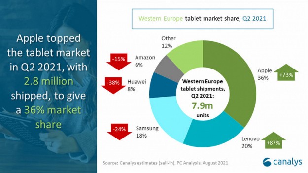 Продажи планшетов в Западной Европе выросли на 18%, лидером рынка является AppleСпециалисты аналитической компании Canalys опубликовали данные за второй квартал 2021 года, относящиеся к западноевропейскому рынку планшетов. По их подсчетам, за отчетсный период было продано 7,9 млн этих устройств.