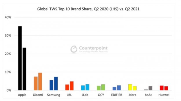 Спрос на устройства названной категории продолжает уверенно расти. По оценкам, во второй четверти текущего года мировые поставки TWS-наушников взлетели более чем на четверть по сравнению с тем же периодом прошлого года — на 27 %. Таким образом, как отмечается, отрасль оправилась от удара коронавируса, который негативно повлиял на развитие рынка в 2020 году. Говорится также, что в квартальном исчислении рост поставок оказался не слишком заметным. Крупнейшим игроком рынка TWS является Apple, но доля компании сокращается под давлением конкурентов. Так, если во второй четверти 2020-го «яблочная» империя контролировала около 35 % отрасли, то по итогам второго квартала текущего года — приблизительно 23 %.