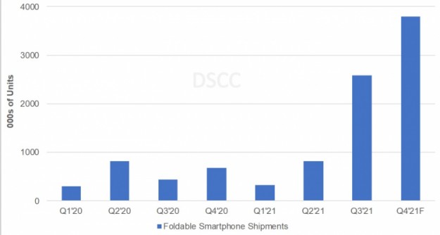 Как считают в DSCC, успех сегмента и Samsung несколько омрачается задержками продаж моделей других брендов, вызванными дефицитом чипов. По прогнозам компании, поставки смартфонов с гибкими дисплеями вырастут на 241 % до 7,5 млн единиц. В 2022 году будет поставлено 17,5 млн смартфонов, рост составит 132 %.