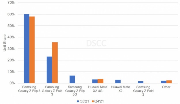 В пересчёте на модели, больше всего продаж пришлось на Samsung Galaxy Z Flip 3 (60 %) — благодаря цене $999, на 31 % дешевле, чем продаётся Z Flip 5G. Кроме того, модель имеет более дисплей большего размера, с более высокой яркостью и изменяемой частотой обновления экрана до 120 Гц, смартфон водонепроницаем и хорошо защищён. На долю Z Fold 3 приходится 23 % поставок, причём цена на 11 % ниже, чем в своё время у Z Fold 2, поддерживается ввод с помощью стилуса, используется скрытая под экраном камера, применяется защита от воды, повышены яркость и прочность. Z Flip 5G стал пятым по популярности смартфоном квартала, на его долю пришлось 7 % продаж. По 3 % получили Mate X2 и X2 4G. Примечательно, что на рынке самих гибких панелей для смартфонов доминирует тоже Samsung с 95 %. По прогнозам DSCC в четвёртом квартале рост снова достигнет рекордных показателей, поквартальный — на 47 %, погодовой — более 450 %, достигнув 3,8 млн экземпляров. Доля Samsung вырастет до 95 %. Ожидается, что лидерство сохранит модель Z Flip 3 с 58 %, доля Z Fold 3 вырастет до 36 %, а Mete X2 4G — до 4 %.