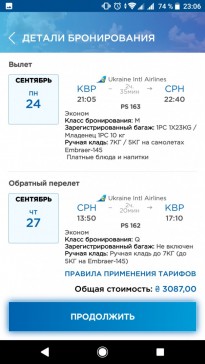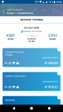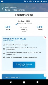 Переходим к поиску и бронированию билетов. Пользователю нужно определиться с направлением, датой вылета и возвращения (не обязательно, если покупаете поездку в одну сторону), а также датой путешествия. Выбираем – Киев-Копенгаген на 24 сентября 2018 года с возвращением через 3 дня – 27 сентября. Результат выдал 2 варианта поездки. Первый на 11:30, а второй на 21:05. Время в полете – 2 часа 30 мин. Обратите на разницу в цене – 2720 грн против 1453 грн. Второй вариант – рейс PS163 – очень выгодный ход, но учтите, что с собой можно взять только ручную кладь весом до 7 кг. Если захотите взять большую сумку – то билет возрастет в цене до 1876 грн.