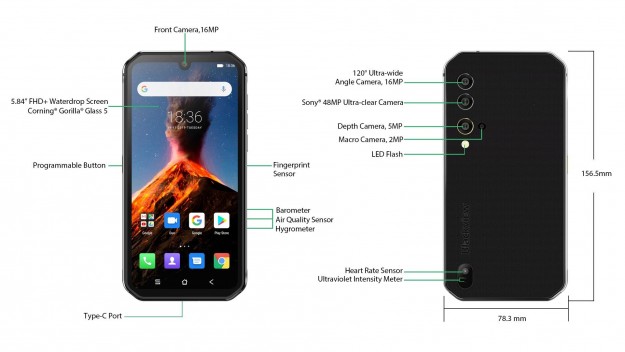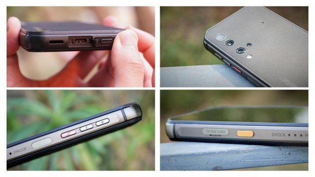 Торцы корпуса модели BV9900 выполнена из алюминиевого сплава, поэтому телефон достаточно монолитен. Левая сторона получила слот для SIM-карты и программируемую кнопку, которую можно настроить для функции быстрого доступа или быстрого открытия специального приложения. На правой стороне датчик отпечатков пальцев для быстрой разблокировки. Внизу барометр, датчик качества воздуха, гигрометр. Верхний торец остался гладким и аккуратным, без кнопок и слотов для карт. На нижней стороне находится порт зарядки USB Type-C, который используется совместно с разъемом для наушников.
