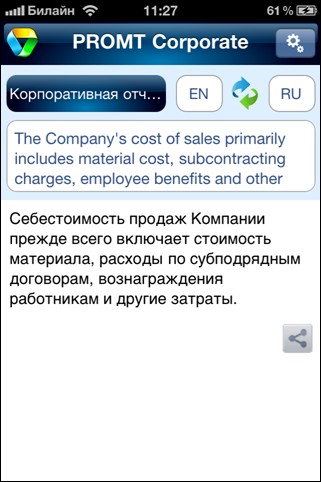 PROMT представляет мобильное приложение на базе iOS для отраслевых продуктовPROMT анонсировала мобильное приложение PROMT Corporate для отраслевых продуктов по машинному переводу. «Пользователи наших корпоративных решений давно спрашивали нас о приложении под iOS, – говорит директор по продажам PROMT Ольга Белая. – И мы наконец-то можем их порадовать: такое приложение появилось в AppStore! Сотрудники компаний, где уже развернут сервер переводов PROMT, могут скачать Переводчик PROMT Corporate абсолютно бесплатно на свой iPhone или iPad, синхронизировать его с сервером переводов своей компании получить все те же возможности, что и их коллеги в офисе».