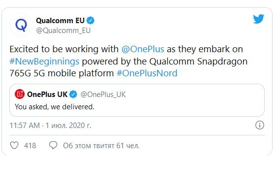 Qualcomm назвала чипсет OnePlus Nord
