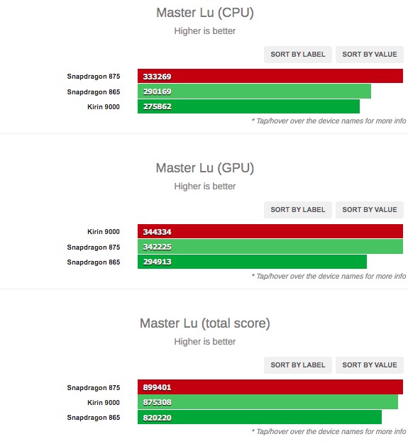 Первые результаты тестов грядущего флагманского чипсета Qualcomm Snapdragon 875 выглядят многообещающе. Сегодня авторитетный техноблог Digital Chat Station опубликовал сравнение результатов тестов нового процессора Qualcomm с его предшественником Snapdragon 865, а также с флагманом Huawei Kirin 9000 в бенчмарке Master Lu.