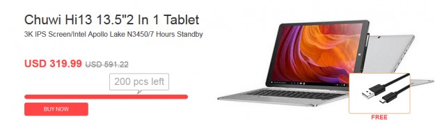 Chuwi Hi13 на этой распродаже продается за $319 с бесплатным кабелем USB Type C.