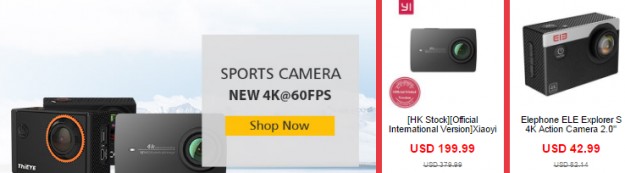 Экшн-камеры - http://promotion.geekbuying.com/promotion/fan_festival#title9 Elephone ELE Explorer S - $42.99 $82.14 Основные возможности этого устройства следующие: запись 4К видео, цветной экран на 2 дюйма на корпусе, матрица Sony IMX179 на 16 Мпикс. с углом съемки в 170 градусов, процессор Allwinner V3, защита от влаги. Xiaoyi YI Action Camera - $72.99 $144.04