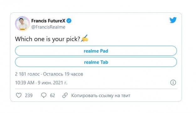 Realme начала тизерить первый планшет и предлагает выбрать названиеВ последние годы рынок Android-планшетов заметно поугас. Заметив падение конкуренции, возродить их выпуск в рамках серии Mi Pad намерилась Xiaomi, а присоединиться к ней со своим первым планшетом решила и Vivo. И, судя по твиту директора отдела маркетинга Realme Фрэнсис Вонг (Francis Wong), молодой и бурно растущий бренд также не намерен оставаться в стороне. Сегодня утром он спросил у своих подписчиков, нравится ли им название "Realme Pad". В комментариях к записи тут же возникли споры с предложениями варианта "Realme Tab" и маркетолог запустил опрос с выбором из двух этих вариантов.