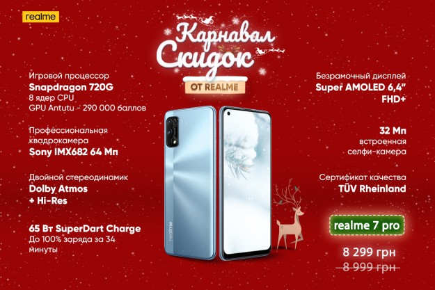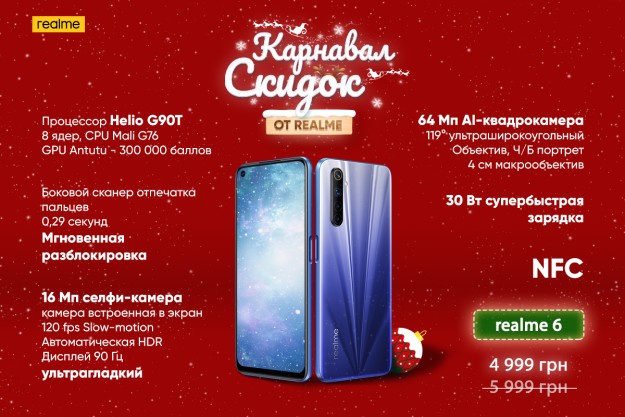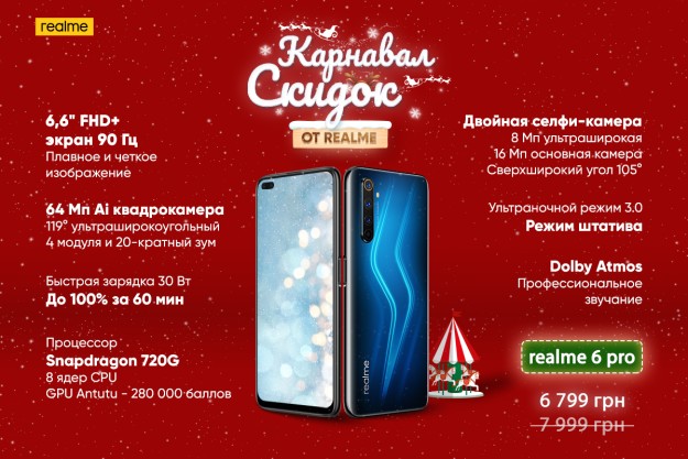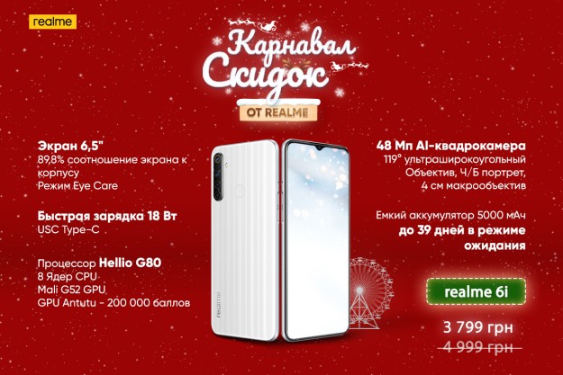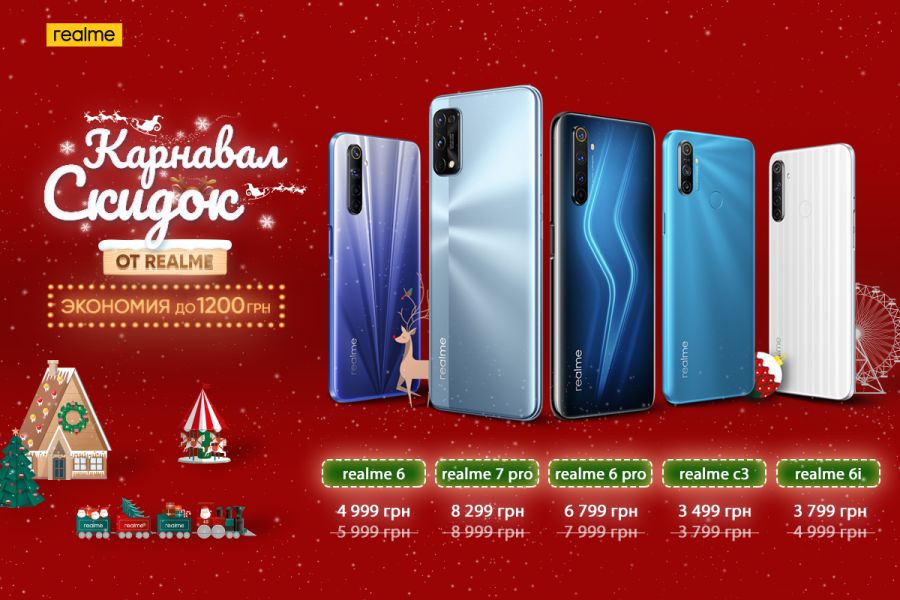 realme объявил карнавал новогодних скидок2020 — год под знаком realme, год триумфального появления молодого и быстро развивающегося бренда на рынке Украины. За это время продукты компании завоевали огромную армию поклонников во всем мире, realme - самый быстрорастущий первый в истории мобильный бренд преодолевший порог в 50 миллионов продаж в течение 9 кварталов благодаря стильному молодежному дизайну, использованию новейших технологий, отличному качеству и супер ценам. А сейчас, во время предпраздничного шоппинга, realme приглашает всех на карнавал скидок — прекрасная возможность купить крутые подарки близким, побаловать себя и сэкономить до 1200 грн! Цены актуальны при покупке в магазинах: realme 6realme 6 позиционирует себя как гейминогвый смартфон с четырьмя камерами и стал первой моделью в линейке бренда, получившей мощный процессор Mediatek G90T, а также экран Full HD+ с частотой обновления до 90 Гц. А это возможность не только комфортно играть, но и стримить сам процесс игры. Емкости аккумулятор в 4300 мАч хватит даже на самый затяжной батл, а быстрая зарядка мощностью 30 ватт полностью заряжает аккумулятор всего за 55 минут. Есть в смартфоне и продвинутая квадрокамера, которая обеспечит отличную детализацию, четкость, яркость и широкий диапазон твоим снимкам. Специальный ультраночной режим съемки позволяет снимать ночью без вспышки, а для стабилизации видео и защиты от дрожания рук используется фирменная технология UIS Max. 6,5 дюймовый дисплей покрыт защитным стеклом Gorilla Glass 3. Космический дизайн придаст завершенность твоему образу.