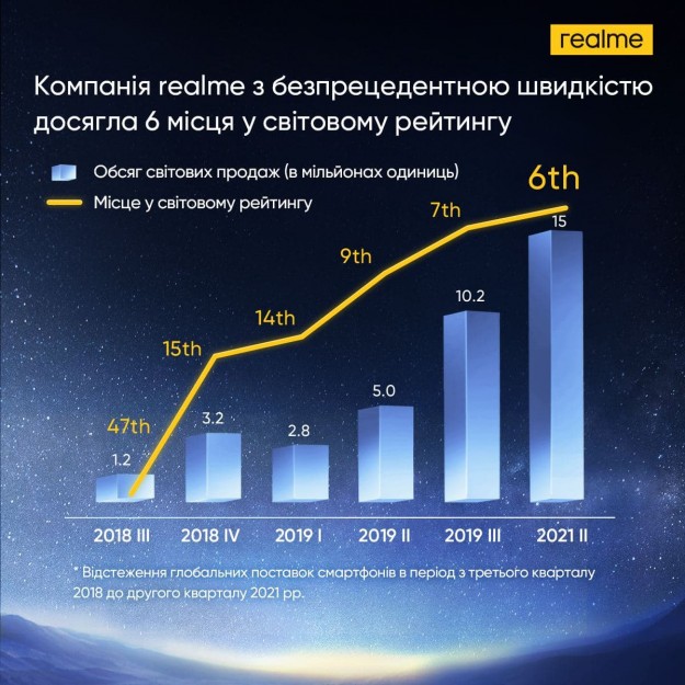 Начав с ничем не примечательного бренда, realme превзошла все ожидания основателей и потребителей. Она охватила более чем 61 рынок во всем мире и вошла в топ-5 брендов на более чем 18 из них, заняв первое место в Филиппинах и Бангладеш, третье в России, четвертое в Индии и пятое место в регионе Европы во 2-м квартале 2021 года. Согласно данным исследовательской компании Strategy Analytics 2021 Q2, в прошлом месяце realme стала брендом, который быстрее чем другие когда-либо поставлял на рынок 100000000 смартфонов. Это получилось благодаря учету требований потребителей, а также интеграции передовых технологий. Телефоны realme были первыми в сегменте со всплывающей камерой, первыми на Android с магнитной технологией беспроводной зарядки и одними из первых с камерой на 64 Мп. Эти инноваций по доступным ценам пришлись по вкусу молодой аудитории, представители которой разбирающиеся в технологиях, быстро стали страстными поклонниками бренда. realme также предоставляет приоритет продуктам с поддержкой 5G. Доля компании realme в поставках смартфонов на развивающихся рынках, выросла с 8,8% в 1-м квартале до 15,9% во 2-м квартале.