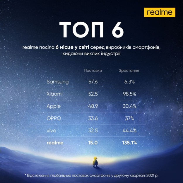 realme впервые вошла в топ-6 поставщиков смартфонов во всем миреrealme вошел в топ-6 поставщиков смартфонов в мировом рейтинге. Это стало известно благодаря аналитическим данным рынка от Counterpoint Research. Компания заняла шестое место с 15 миллионами поставок и ростом на 135,1% во втором квартале 2021 года. Этих прорывных результатов в области бренд достиг всего за три года.