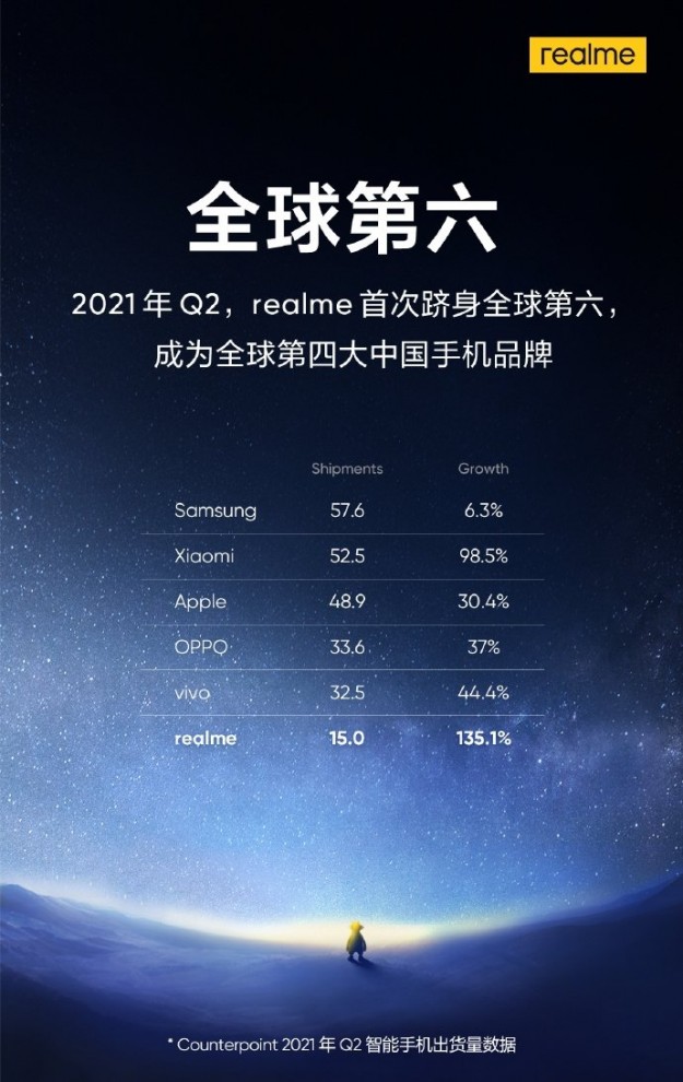 Realme взлетела ещё выше и впервые вошла в Топ-6 самых успешных поставщиков смартфонов в миреДолгое время компания занимала седьмое место 22 сентября вице-президент Realme объявил, что Realme впервые заняла шестое место в рейтинге самых успешных поставщиков смартфонов в мире. Во втором квартале 2021 года поставки смартфонов Realme выросли на 135,1%, что сделало его брендом с самыми высокими темпами роста среди шести ведущих мировых производителей.