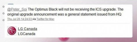 Релиза Android 4.0 для LG Optimus Black не будетКанадский офис компании LG на днях подтвердил, что производитель не будет выпускать ОС Android 4.0 под смартфон LG Optimus Black. Правда, любопытно то, что немногим позже это заявление было стерто с микроблога компании в Сети Twitter, однако ряд Западных СМИ располагает скрин-шотом, подтверждающим существование такого рода записи.