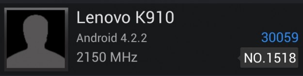 Результат Lenovo K910 в AnTuTu преодолел отметку в рекордные 30000 балловКомпания Lenovo готовит к выпуску преемника смартфона K900 — аппарат Lenovo K910. Не анонсированный еще девайс был замечен в бенчмарке AnTuTu, где набрала впечатляющие 30059 баллов. Работает Lenovo K910 под управлением операционной системы Android 4.2.2.