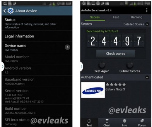 Результаты Galaxy Note III в AnTuTu не порадовалиВ преддверии завтрашнего анонса смартфона Samsung Galaxy Note III twitter-аккаунт @evleaks опубликовал в Интернет результаты тестирования его LTE-версии бенчмарком AnTuTu. Девайс с номером модели SM-N9005 набрал в тестере 24497 баллов.