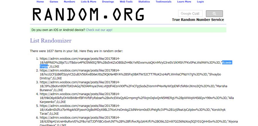 Определение победителей, среди 1637 участников, проводилось с помощью программы RANDOM.ORG: