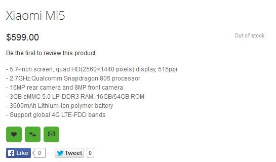 Ритейлер Oppomart рассекретил спецификации флагмана Xiaomi Mi5На сайте онлайн-ритейлера Oppomart появилась страница, посвященная не представленному еще официально флагманскому смартфону Xiaomi Mi5, с его спецификациями и даже стоимостью. Итак, как стало известно, новинка получит от производителя 5.7-дюймовый экран с разрешением 1440x2560 точек, плотность пикселей на дюйм — 515, 4-ядерный процессор серии Snapdragon 805 от Qualcomm с тактовой частотой 2.7 ГГц и графикой Adreno 420, 3 ГБ оперативной памяти LP-DDR3 и 16/64 ГБ внутренней.
