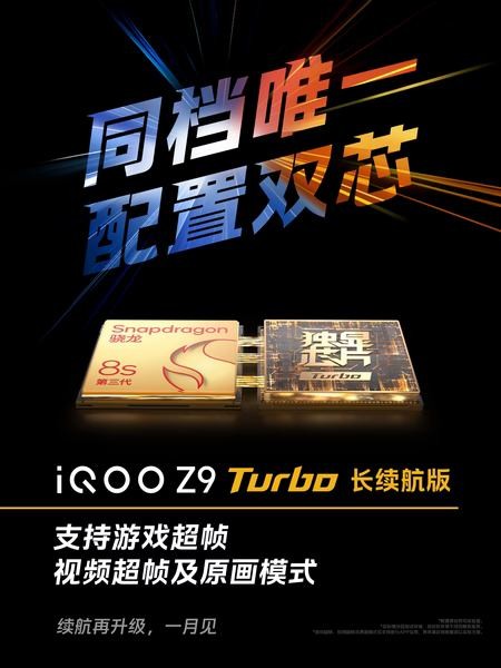 iQOO Z9 Turbo буде побудований на субфлагманській SoC Snapdragon 8s Gen3, причому вона буде доповнена чіпом для прискорення графіки. Цей тандем повинен забезпечити більш високу кадрову частоту в іграх і в цілому поліпшити графіку.