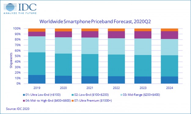 Исследование, проведённое компанией International Data Corporation (IDC), говорит о том, что мировой рынок смартфонов претерпевает трансформацию из-за пандемии и нестабильной экономической обстановки. Отмечается, что потребители стали значительно реже покупать дорогие сотовые аппараты. Во второй четверти нынешнего года на долю смартфонов стоимостью от $100 до $400 пришлось 60 % в общем объёме продаж. К концу года данный показатель, как ожидается, поднимется до 63 %.
