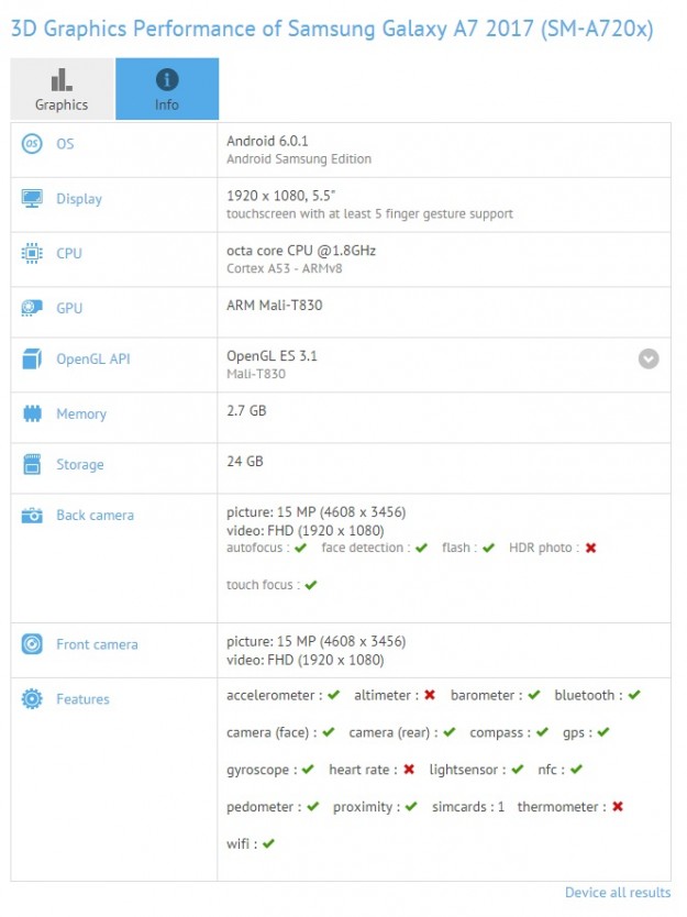 Samsung Galaxy A7 (2017) получит 16-Мп фронталкуВ ближайшие месяцы Samsung представит третье поколение смартфонов Galaxy A, которое будет датировано 2017 годом. Благодаря GFXBench стали известны основные характеристики модели A7 (2017). Они включают 5,5" Full HD-экран, восьмиядерный чипсет с частотой до 1,8 ГГц (скорее всего, Snapdragon 652), 3 ГБ оперативной и 32 ГБ встроенной памяти, две 16-Мп камеры (тыльная и фронтальная), модуль NFC и встроенный шагомер. В Manhattan 3.1 смартфон набрал 8,8-8,9 fps, в T-Rex – 31,1 fps (результаты в onscreen и offscreen очень близки, так как оба раза тест прогоняется с разрешением 1920x1080 точек).