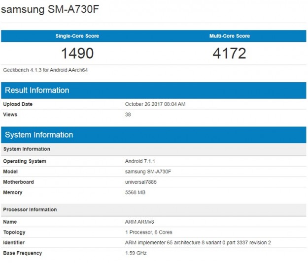 Samsung Galaxy A7 (2018) с 6 ГБ ОЗУ засветился в GeekbenchБлижайшими смартфонами Samsung, скорее всего, станут представители серии Galaxy A (2018). Недавно его дизайн с «бесконечным» дисплеем засветился на CAD-рендере от @OnLeaks, а теперь в бенчмарке AnTuTu показались характеристики старшей версии – Galaxy A7 (2018). Наиболее примечательным является объем оперативной памяти – 6 ГБ в Samsung представлено в единичных моделях, а Galaxy A являются устройствами средней категории, что тем более является удивительным. Также Geekbench указал нам на чипсет Exynos 7885 с частотой 1,6 ГГц и Android 7.1.1 Nougat. Тесты показали такие результаты: 1490 очков в одноядерном режиме и 4172 баллов в многоядерном. Когда состоится премьера, пока сказать сложно. Скорее всего, мы увидим трио в январе.