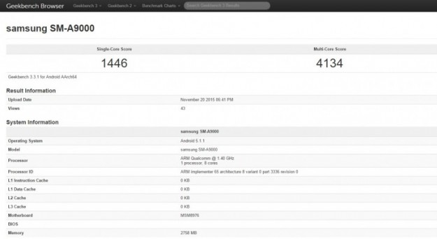 Samsung Galaxy A9 с Snapdragon 620 SoC "засветился" в GeekBenchВ базе данных бенчмарка Geekbench "засветился" не анонсированный еще смартфон южнокорейской Samsung - Galaxy A9 (SM-A9000). Среди спецификаций новинки в тестере указан 64-битный 8-ядерный процессор Qualcomm Snapdragon 620 MSM8976 с графикой Adreno 510, а также 3 ГБ оперативной памяти и ОС Android 5.1.1 Lollipop. Galaxy A9 набрал в одно- и многоядерном режиме тестирования 1446 и 4134 балла соответственно, в то время как его предшественник Galaxy A8 в этом же бенчмарке c Snapdragon 615 "на борту" показывал результат в 937 и 3236 набранных очков.