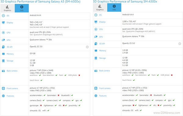 Galaxy Alpha A5, по данным бенчмарка GFX Benchmark, является обладателем 5-дюймового Super AMOLED-дисплея с разрешением 1280х720 точек, 64-битного 4-ядерного процессора серии Snapdragon 410 от Qualcomm с частотой 1.2 ГГц и графикой Adreno 306, 2 ГБ оперативной памяти и 16 ГБ расширяемой встроенной, аккумулятора на 2300 мАч, а также 5Мп фронтальной камеры и 13Мп основной с возможностью записи Full HD-видео. Размеры его корпуса составляют 139.3х69.7х6.7 мм, а вес —126 грамм. Модели Galaxy A3, как стало известно, достался Super AMOLED экран диагональю 4.5 дюймов с разрешением 960х540 пикселей, 64-разрядный 4-ядерный чип Qualcomm Snapdragon 410 с частотой 1.2 ГГц, графическое ядро Adreno 306, 1 ГБ ОЗУ и 16 ГБ ПЗУ, слот для microSD-карт, 5Мп фронтальный фотомодуль и 8Мп основной с возможностью видеосъемки в Full HD-разрешении. Работают обе новинки на базе операционной системы Android 4.4.4 KitKat. Согласно последним данным, стоимость Samsung Galaxy Alpha A3 составит $350-$400, а модель Alpha A5 можно будет приобрести за $400-$450. Джерело: SmartPhone.ua Обговорення новиниКоментариев пока никто не оставил. Станьте первым! Попередні новини