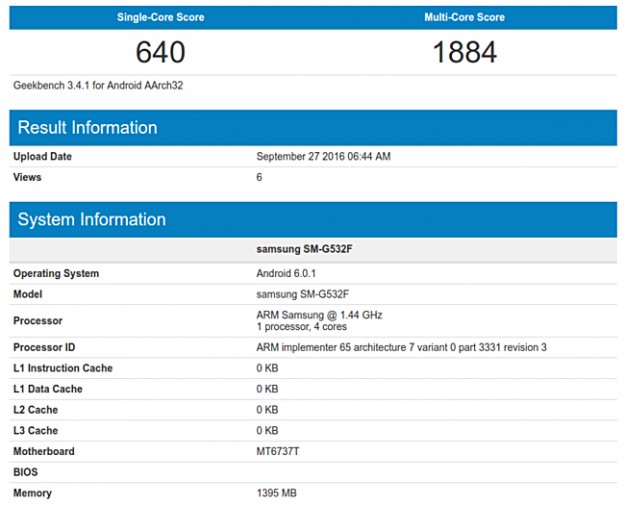 Больше информации о будущей новинке южнокорейского производителя утекло в Сеть после прохождения ею в прошлом месяце тестирования производительности в бенчмарках Geekbench и GFXBench. В частности, тестеры сообщали о наличии на борту Galaxy Grand Prime (2016) 4-ядерного процессора MediaTek MT6737T с тактовой частотой 1.4 ГГц, 2 ГБ оперативной памяти, 5Мп фронтальной камеры и 8Мп основной.