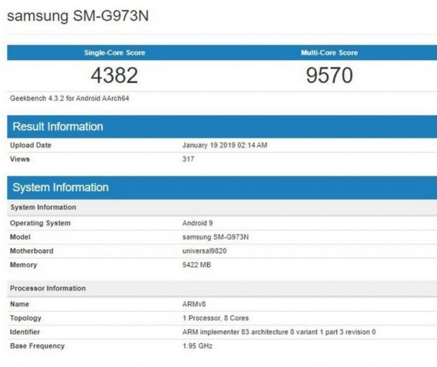 Galaxy S10 набрал в бенчмарке 4382 в однопоточном тесте и 9570 в многопоточном. Речь идёт о версии на базе процессора Exynos 9820 с 6 ГБ оперативной памяти.