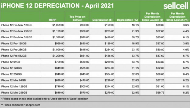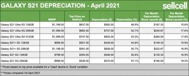 Как и большинство современных товаров, смартфонам свойственно падать в цене с течением времени. Отчёт, подготовленный изданием SellCell, раскрывает любопытные показатели главных конкурентов от Android и iOS-миров: семейств Samsung Galaxy S21 и iPhone 12. Подсчёты показывают, что южнокорейские новинки с момента анонса в январе обесценились на 44,8 – 57% стоимости. В то же время заметно более старые iPhone 12 потеряли от 18 до 33,7% цены.