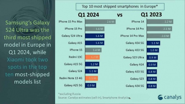 Аналітики Canalys опублікували дані щодо поставок смартфонів у Європі в першому кварталі 2024 року. Глобальним лідером виявився iPhone 15 Pro Max, що очікувано. На другому місці з результатом 1,6 млн пристроїв посів iPhone 15 Pro, а на третьому місці з майже таким же результатом влаштувався Samsung Galaxy S24 Ultra. Таким чином, флагман Samsung - найпопулярніший у Європі смартфон у першому кварталі поточного року.