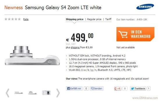 Samsung Galaxy S4 Zoom получил ценовую бирку в 499 евроКомпания Samsung анонсировала смартфон Galaxy S4 Zoom с 16-мегапиксельной камерой с BSI CMOS сенсором и десятикратным оптическим увеличением на прошлой неделе. А сегодня стало известно, что на новинку уже начали принимать предварительные заказы в Германии. Онлайн-ритейлер Cyberport.de продает S4 Zoom по цене 499 евро.