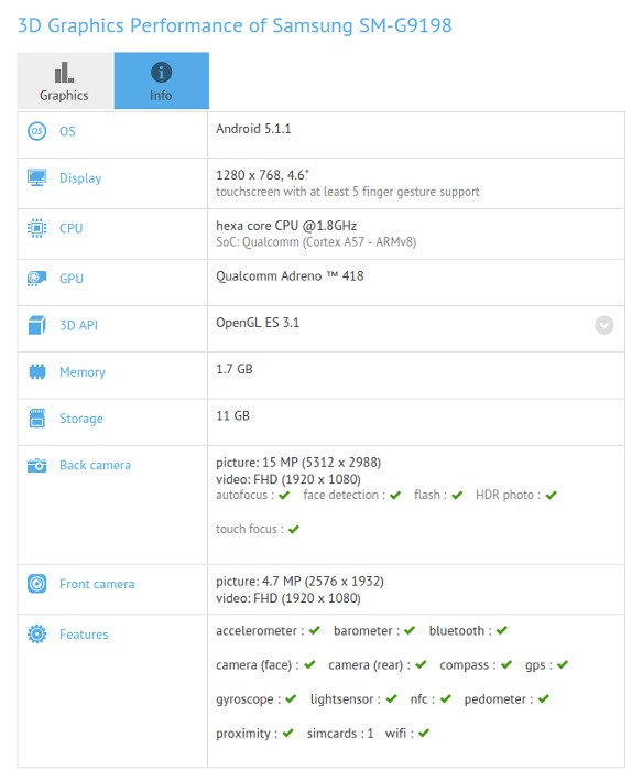 Samsung Galaxy S6 Mini с 6-ядерным Snapdragon 808 "засветился" в GFXBenchВ базе данных бенчмарка GFXBench был замечен новый смартфон компании Samsung с индексом SM-G9198, который с долей здорового скептицизма можно принять за мини-версию флагмана Galaxy S6. Согласно данным тестера, гаджет оснащен 4.6-дюймовым дисплеем с разрешением 1280х768 пикселей, 64-битным 6-ядерным процессором серии Snapdragon 808 от Qualcomm с тактовой частотой 1.8 ГГц и графикой Adreno 418, 2 ГБ оперативной памяти и 16 ГБ встроенной, из которой пользователю доступно порядка 11 ГБ.