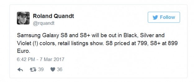 Источник рассекретил также стоимость будущих новинок южнокорейского производителя, официальный анонс которых, напомним, состоится 29 марта. Итак, Galaxy S8, по словам @rquandt, появится на прилавках европейских магазинов с ценником в 800 евро, а Galaxy S8+ за 899 евро.